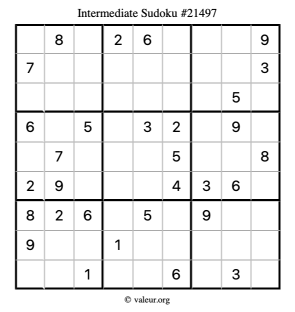Here is our printable Intermediate Sudoku Puzzle #21497. You are welcome to print a copy for yourself and solve it the old-fashioned way with a pencil and an eraser!