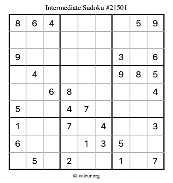 Here is our printable Intermediate Sudoku Puzzle #21501. You are welcome to print a copy for yourself and solve it the old-fashioned way with a pencil and an eraser!