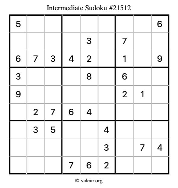 Here is our printable Intermediate Sudoku Puzzle #21512. You are welcome to print a copy for yourself and solve it the old-fashioned way with a pencil and an eraser!