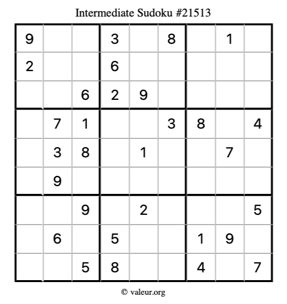 Here is our printable Intermediate Sudoku Puzzle #21513. You are welcome to print a copy for yourself and solve it the old-fashioned way with a pencil and an eraser!