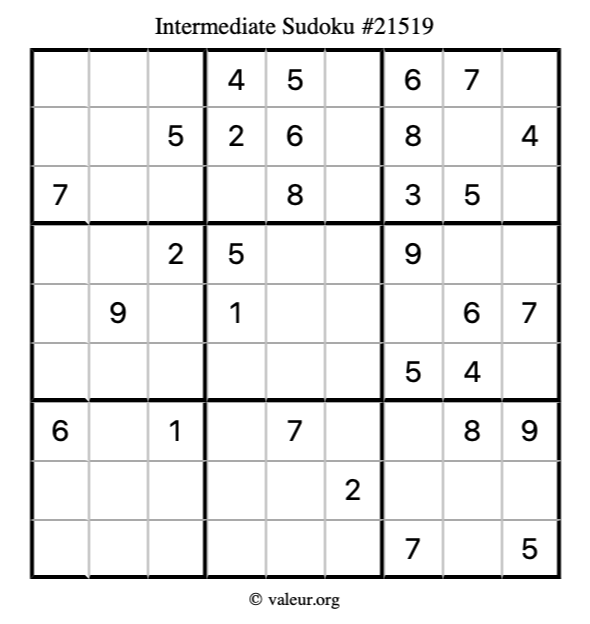 Here is our printable Intermediate Sudoku Puzzle #21519. You are welcome to print a copy for yourself and solve it the old-fashioned way with a pencil and an eraser!