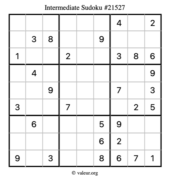 Here is our printable Intermediate Sudoku Puzzle #21527. You are welcome to print a copy for yourself and solve it the old-fashioned way with a pencil and an eraser!