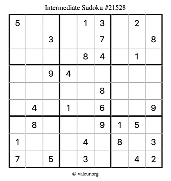 Here is our printable Intermediate Sudoku Puzzle #21528. You are welcome to print a copy for yourself and solve it the old-fashioned way with a pencil and an eraser!
