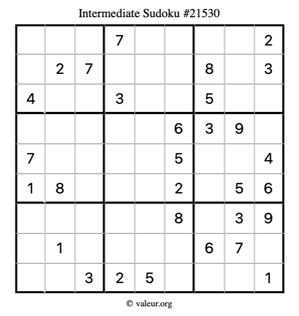 Here is our printable Intermediate Sudoku Puzzle #21530. You are welcome to print a copy for yourself and solve it the old-fashioned way with a pencil and an eraser!
