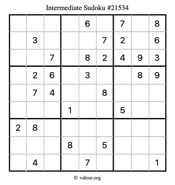 Here is our printable Intermediate Sudoku Puzzle #21534. You are welcome to print a copy for yourself and solve it the old-fashioned way with a pencil and an eraser!