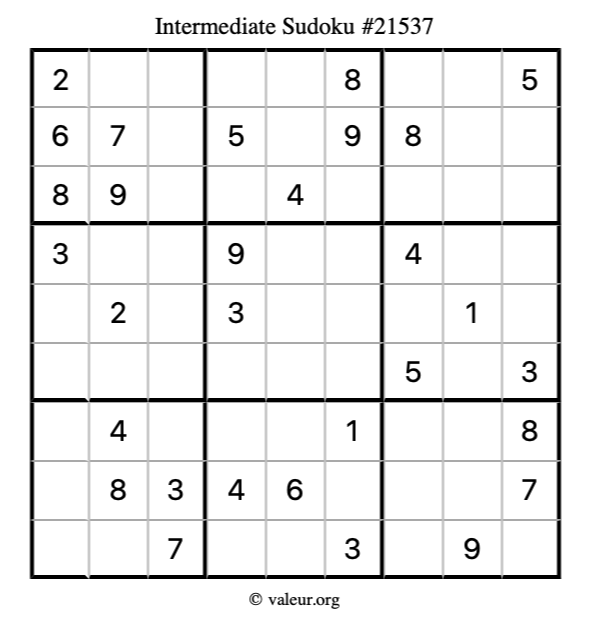 Here is our printable Intermediate Sudoku Puzzle #21537. You are welcome to print a copy for yourself and solve it the old-fashioned way with a pencil and an eraser!