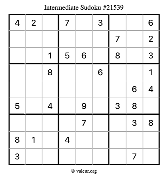 Here is our printable Intermediate Sudoku Puzzle #21539. You are welcome to print a copy for yourself and solve it the old-fashioned way with a pencil and an eraser!