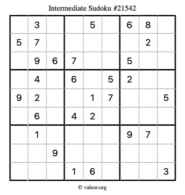 Here is our printable Intermediate Sudoku Puzzle #21542. You are welcome to print a copy for yourself and solve it the old-fashioned way with a pencil and an eraser!