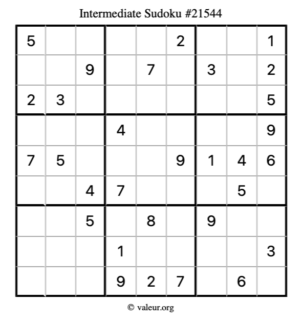 Here is our printable Intermediate Sudoku Puzzle #21544. You are welcome to print a copy for yourself and solve it the old-fashioned way with a pencil and an eraser!