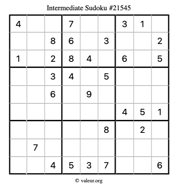 Here is our printable Intermediate Sudoku Puzzle #21545. You are welcome to print a copy for yourself and solve it the old-fashioned way with a pencil and an eraser!