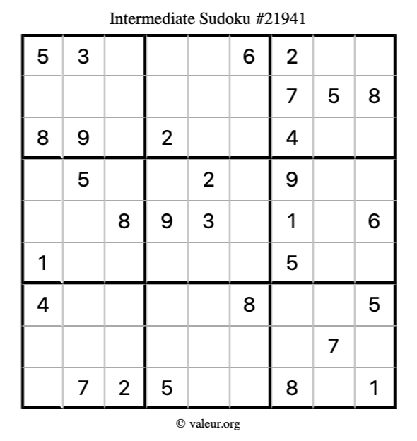 Here is our printable Intermediate Sudoku Puzzle #21941. You are welcome to print a copy for yourself and solve it the old-fashioned way with a pencil and an eraser!
