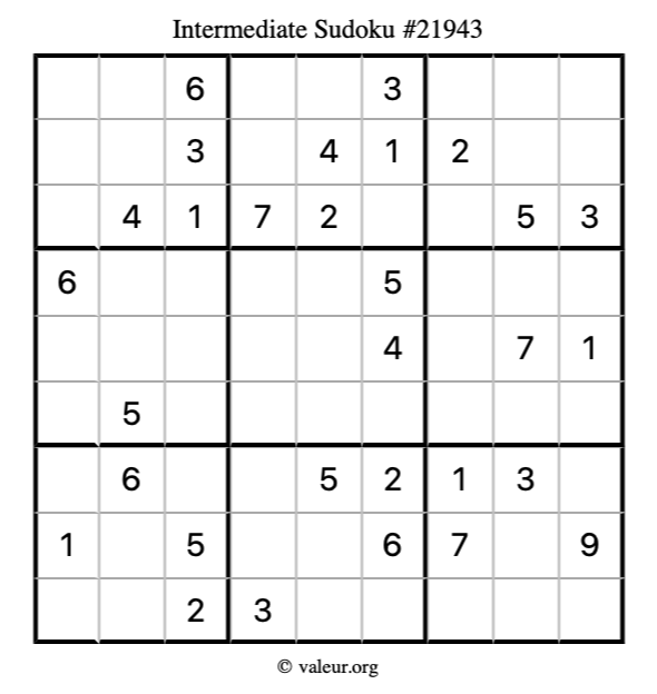 Here is our printable Intermediate Sudoku Puzzle #21943. You are welcome to print a copy for yourself and solve it the old-fashioned way with a pencil and an eraser!