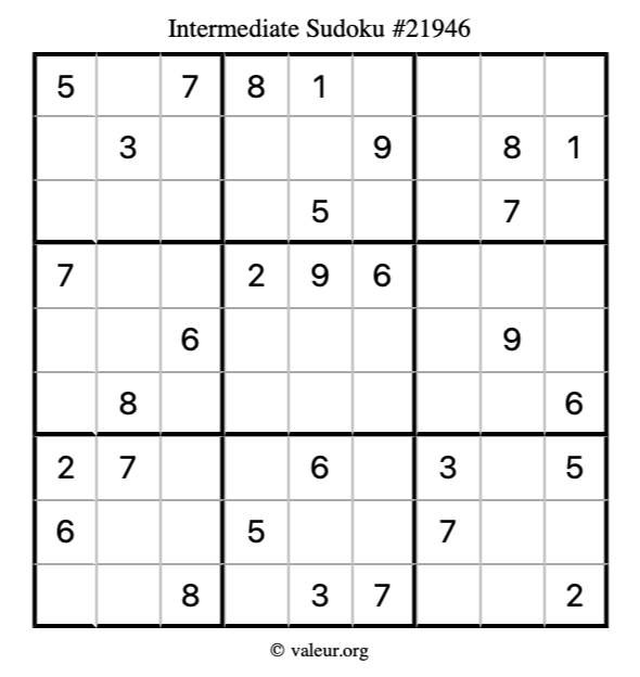 Here is our printable Intermediate Sudoku Puzzle #21946. You are welcome to print a copy for yourself and solve it the old-fashioned way with a pencil and an eraser!