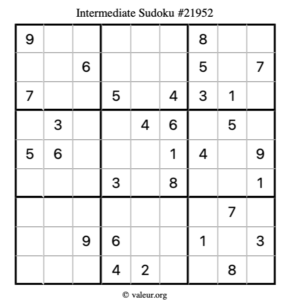 Here is our printable Intermediate Sudoku Puzzle #21952. You are welcome to print a copy for yourself and solve it the old-fashioned way with a pencil and an eraser!