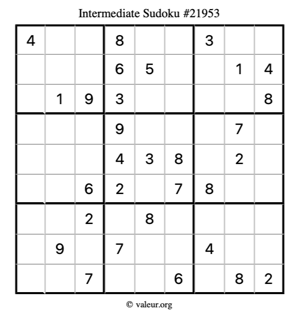 Here is our printable Intermediate Sudoku Puzzle #21953. You are welcome to print a copy for yourself and solve it the old-fashioned way with a pencil and an eraser!