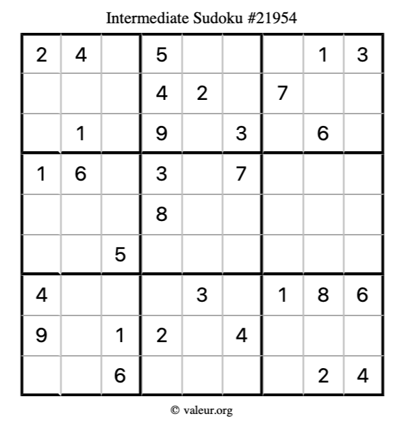 Here is our printable Intermediate Sudoku Puzzle #21954. You are welcome to print a copy for yourself and solve it the old-fashioned way with a pencil and an eraser!