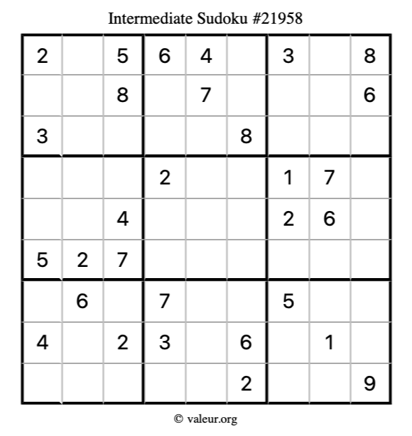 Here is our printable Intermediate Sudoku Puzzle #21958. You are welcome to print a copy for yourself and solve it the old-fashioned way with a pencil and an eraser!