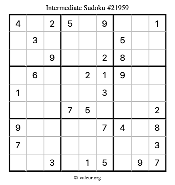 Here is our printable Intermediate Sudoku Puzzle #21959. You are welcome to print a copy for yourself and solve it the old-fashioned way with a pencil and an eraser!