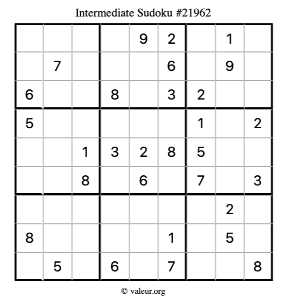 Here is our printable Intermediate Sudoku Puzzle #21962. You are welcome to print a copy for yourself and solve it the old-fashioned way with a pencil and an eraser!