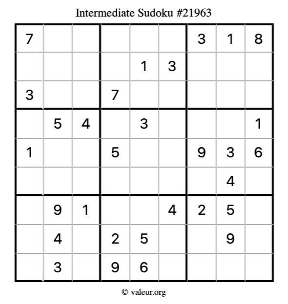 Here is our printable Intermediate Sudoku Puzzle #21963. You are welcome to print a copy for yourself and solve it the old-fashioned way with a pencil and an eraser!