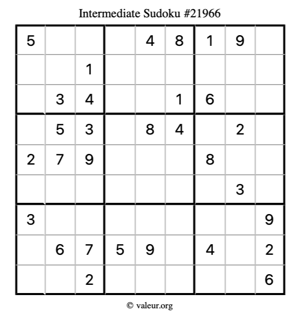 Here is our printable Intermediate Sudoku Puzzle #21966. You are welcome to print a copy for yourself and solve it the old-fashioned way with a pencil and an eraser!