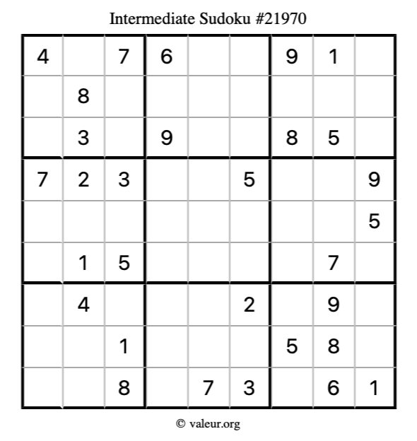 Here is our printable Intermediate Sudoku Puzzle #21970. You are welcome to print a copy for yourself and solve it the old-fashioned way with a pencil and an eraser!