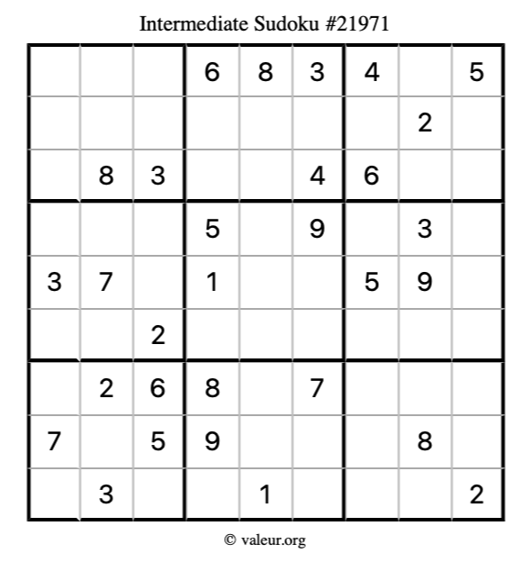 Here is our printable Intermediate Sudoku Puzzle #21971. You are welcome to print a copy for yourself and solve it the old-fashioned way with a pencil and an eraser!
