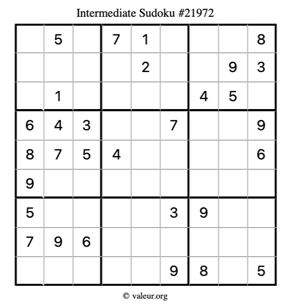 Here is our printable Intermediate Sudoku Puzzle #21972. You are welcome to print a copy for yourself and solve it the old-fashioned way with a pencil and an eraser!
