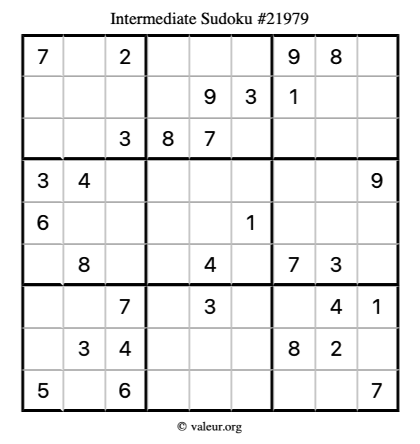 Here is our printable Intermediate Sudoku Puzzle #21979. You are welcome to print a copy for yourself and solve it the old-fashioned way with a pencil and an eraser!