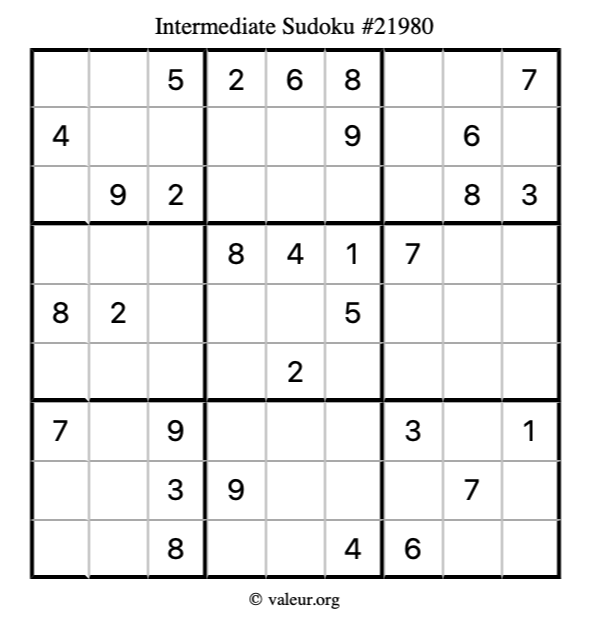 Here is our printable Intermediate Sudoku Puzzle #21980. You are welcome to print a copy for yourself and solve it the old-fashioned way with a pencil and an eraser!