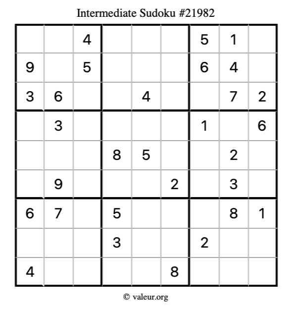 Here is our printable Intermediate Sudoku Puzzle #21982. You are welcome to print a copy for yourself and solve it the old-fashioned way with a pencil and an eraser!