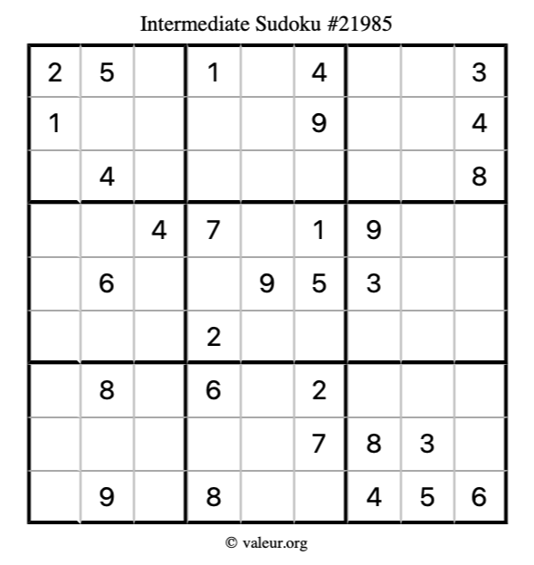 Here is our printable Intermediate Sudoku Puzzle #21985. You are welcome to print a copy for yourself and solve it the old-fashioned way with a pencil and an eraser!