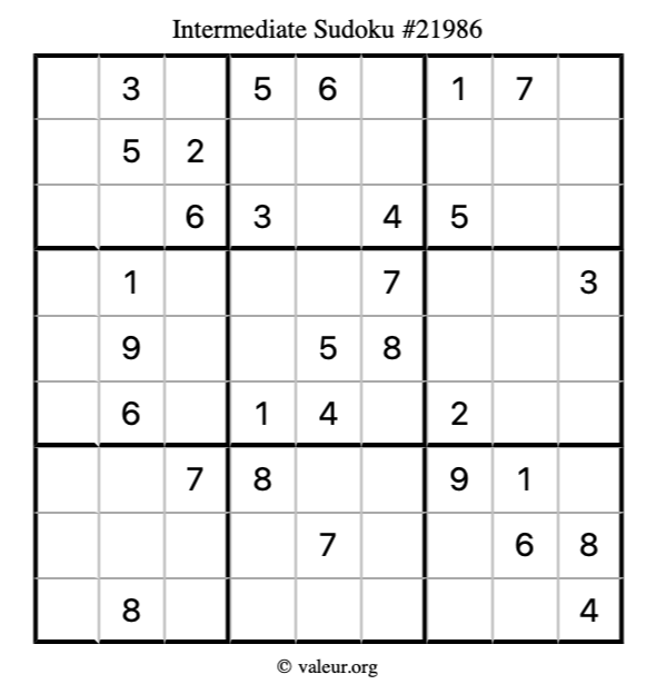 Here is our printable Intermediate Sudoku Puzzle #21986. You are welcome to print a copy for yourself and solve it the old-fashioned way with a pencil and an eraser!
