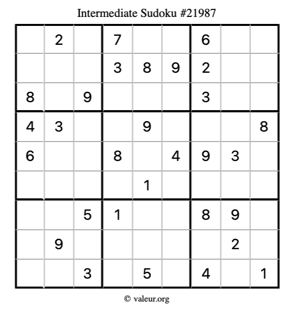 Here is our printable Intermediate Sudoku Puzzle #21987. You are welcome to print a copy for yourself and solve it the old-fashioned way with a pencil and an eraser!