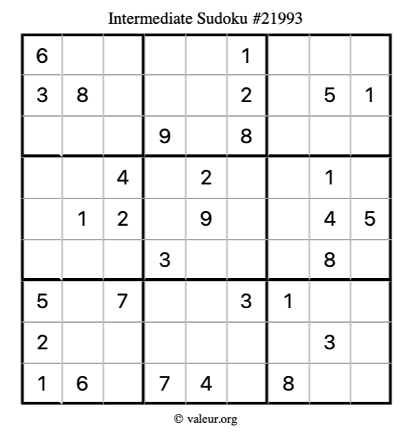 Here is our printable Intermediate Sudoku Puzzle #21993. You are welcome to print a copy for yourself and solve it the old-fashioned way with a pencil and an eraser!