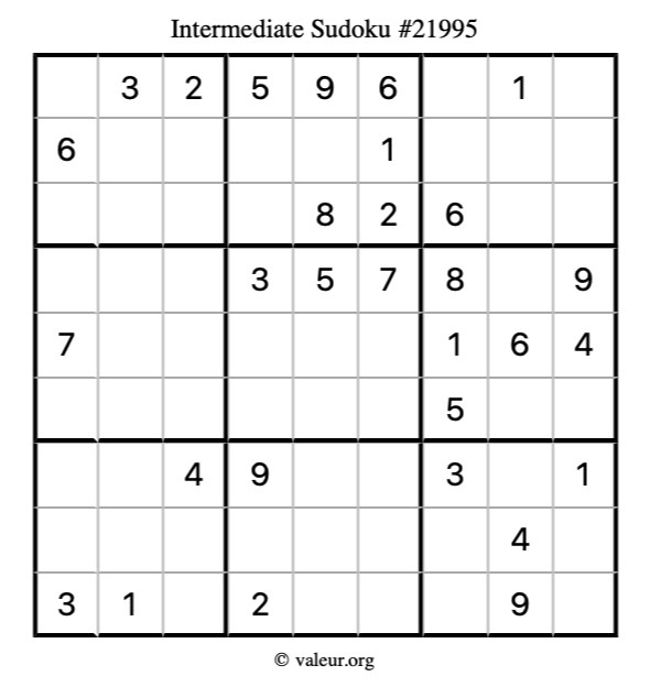 Here is our printable Intermediate Sudoku Puzzle #21995. You are welcome to print a copy for yourself and solve it the old-fashioned way with a pencil and an eraser!