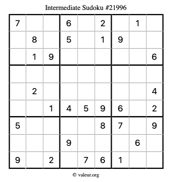 Here is our printable Intermediate Sudoku Puzzle #21996. You are welcome to print a copy for yourself and solve it the old-fashioned way with a pencil and an eraser!