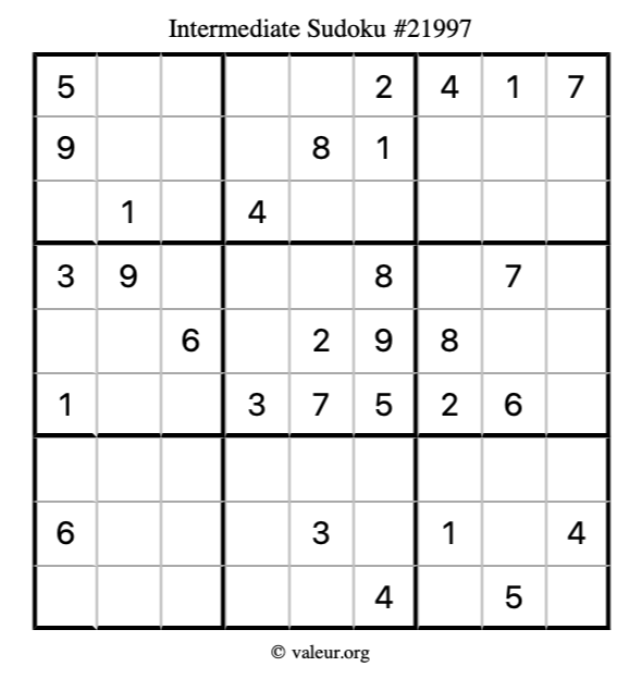 Here is our printable Intermediate Sudoku Puzzle #21997. You are welcome to print a copy for yourself and solve it the old-fashioned way with a pencil and an eraser!