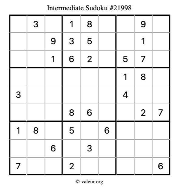 Here is our printable Intermediate Sudoku Puzzle #21998. You are welcome to print a copy for yourself and solve it the old-fashioned way with a pencil and an eraser!
