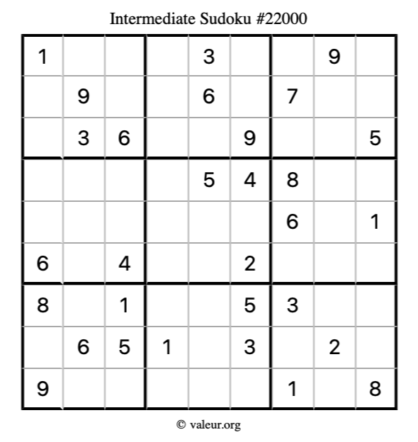 Here is our printable Intermediate Sudoku Puzzle #22000. You are welcome to print a copy for yourself and solve it the old-fashioned way with a pencil and an eraser!