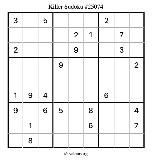 Here is our printable Killer Sudoku Puzzle #25074. You are welcome to print a copy for yourself and solve it the old-fashioned way with a pencil and an eraser!