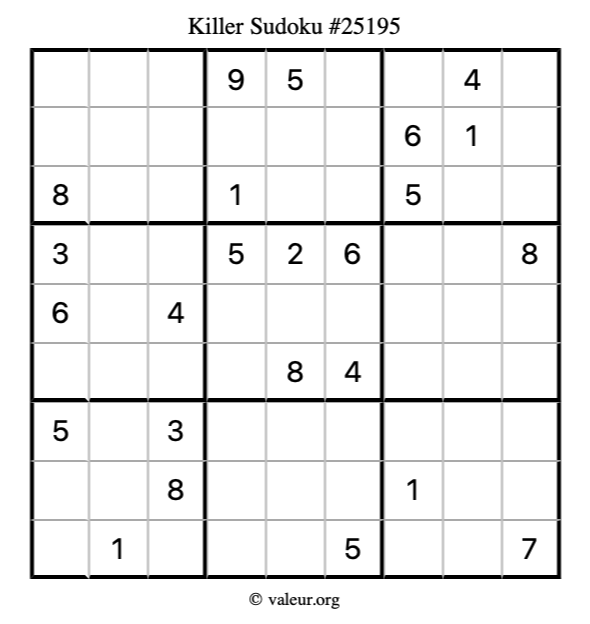 Here is our printable Killer Sudoku Puzzle #25195. You are welcome to print a copy for yourself and solve it the old-fashioned way with a pencil and an eraser!