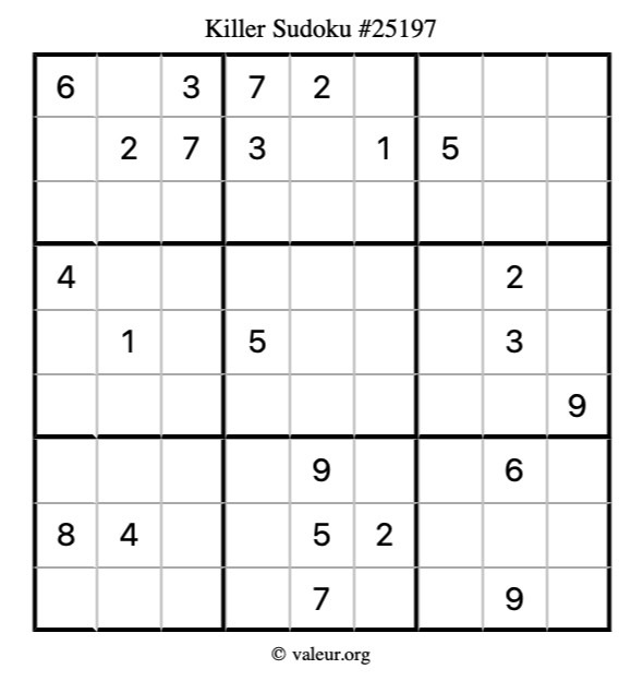 Here is our printable Killer Sudoku Puzzle #25197. You are welcome to print a copy for yourself and solve it the old-fashioned way with a pencil and an eraser!