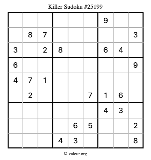 Here is our printable Killer Sudoku Puzzle #25199. You are welcome to print a copy for yourself and solve it the old-fashioned way with a pencil and an eraser!