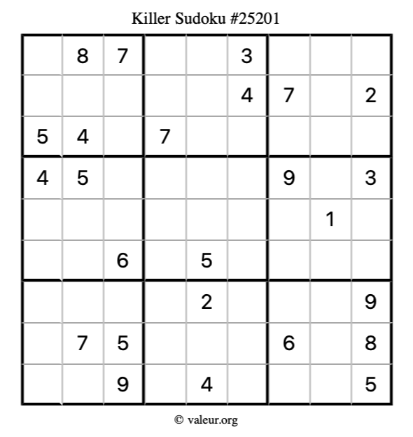 Here is our printable Killer Sudoku Puzzle #25201. You are welcome to print a copy for yourself and solve it the old-fashioned way with a pencil and an eraser!
