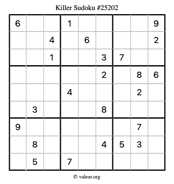 Here is our printable Killer Sudoku Puzzle #25202. You are welcome to print a copy for yourself and solve it the old-fashioned way with a pencil and an eraser!