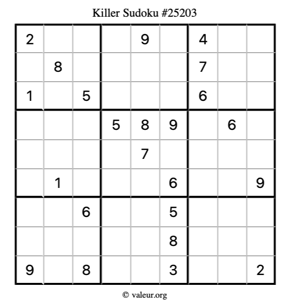 Here is our printable Killer Sudoku Puzzle #25203. You are welcome to print a copy for yourself and solve it the old-fashioned way with a pencil and an eraser!