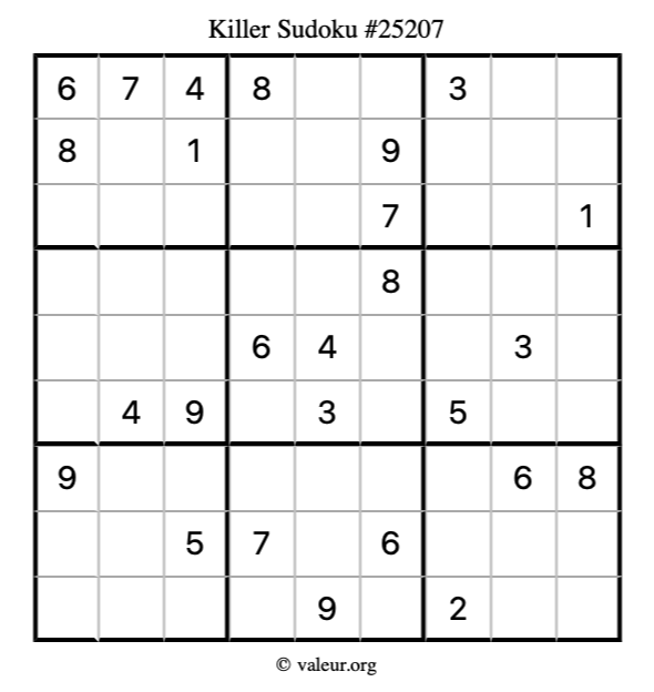 Here is our printable Killer Sudoku Puzzle #25207. You are welcome to print a copy for yourself and solve it the old-fashioned way with a pencil and an eraser!