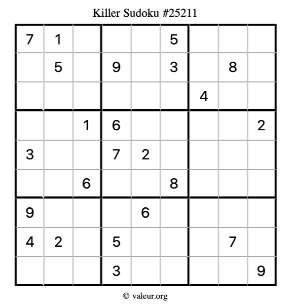Here is our printable Killer Sudoku Puzzle #25211. You are welcome to print a copy for yourself and solve it the old-fashioned way with a pencil and an eraser!