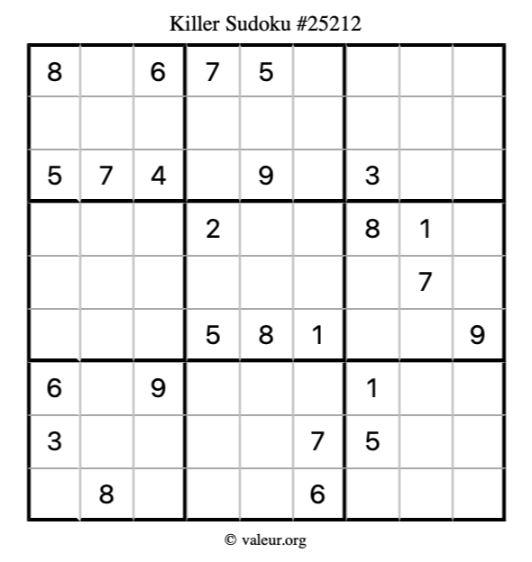 Killer Sudoku puzzle #25212 is not the only killer Sudoku puzzle in our database. We have thousands of killer Sudoku puzzles that you can print and solve. Check them out here!